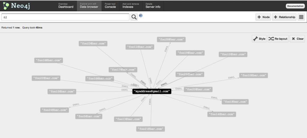 You see that I am using the exact same techniques of my spreadsheet import blog post to generate the Cypher statements required. All I need to do after that is to put all statements into the Cypher worksheet, wrap it with a transaction, and paste that into the neo4j shell of my empty neo4j database. This will execute the queries, insert all nodes, relationships and properties, and voila - we have our Gmail Meter Graph!